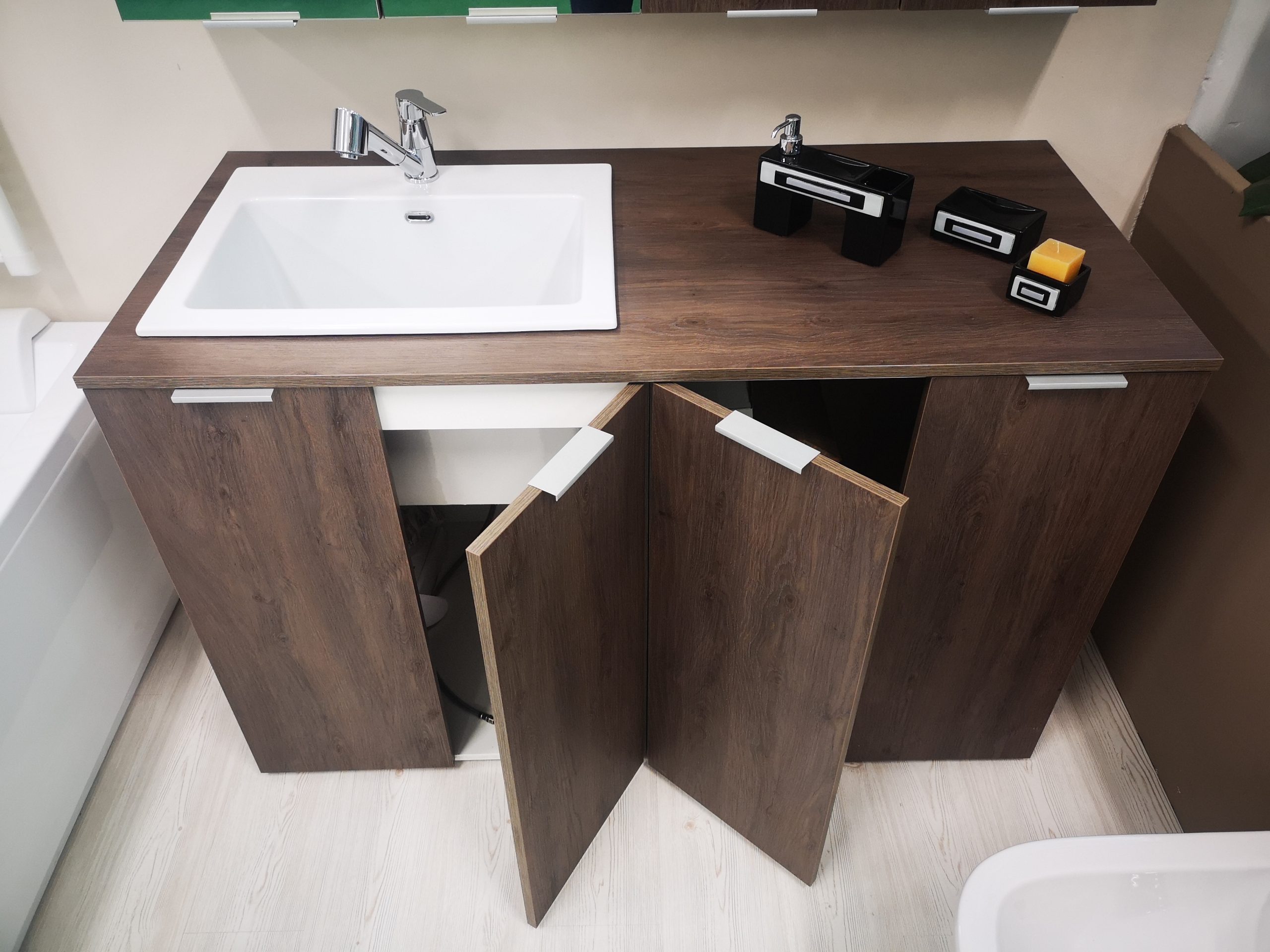 KANDY Mobile lavanderia a pavimento in essenza di rovere scuro con lavatoio integrato 59x48x25 in ceramica bianca (rubinetteria non compresa).